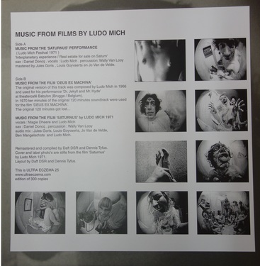 LP record released by Ultra Eczema, the label of Dennis Tyfus, with music by Ludo Mich. Dennis Tyfus set up the label Ultra Eczema in 1997. It produces publications and records by his artist and musician acquaintances. A substantial body of powerfully executed drawings, collages and videos with intense colours and textures has been created in this context, such as the cover for this LP.