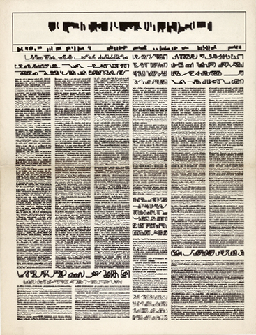 Artist edition | diario n°1, Mirtha Dermisache, 1975. Dermisache features a particular style of asemic writing with out grammar or syntax. She herself coined for her abstract writing the name graphisms. They have no informational remit, but preserve in this case the architecture of the news paper. Republished by Guy Schraenen